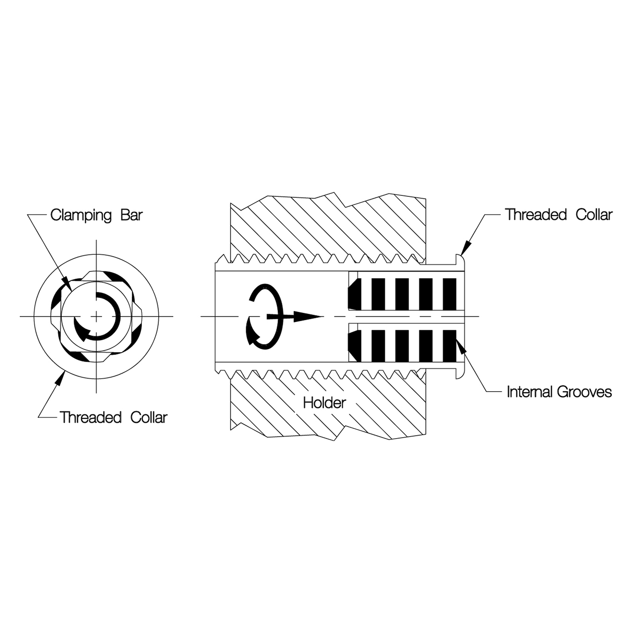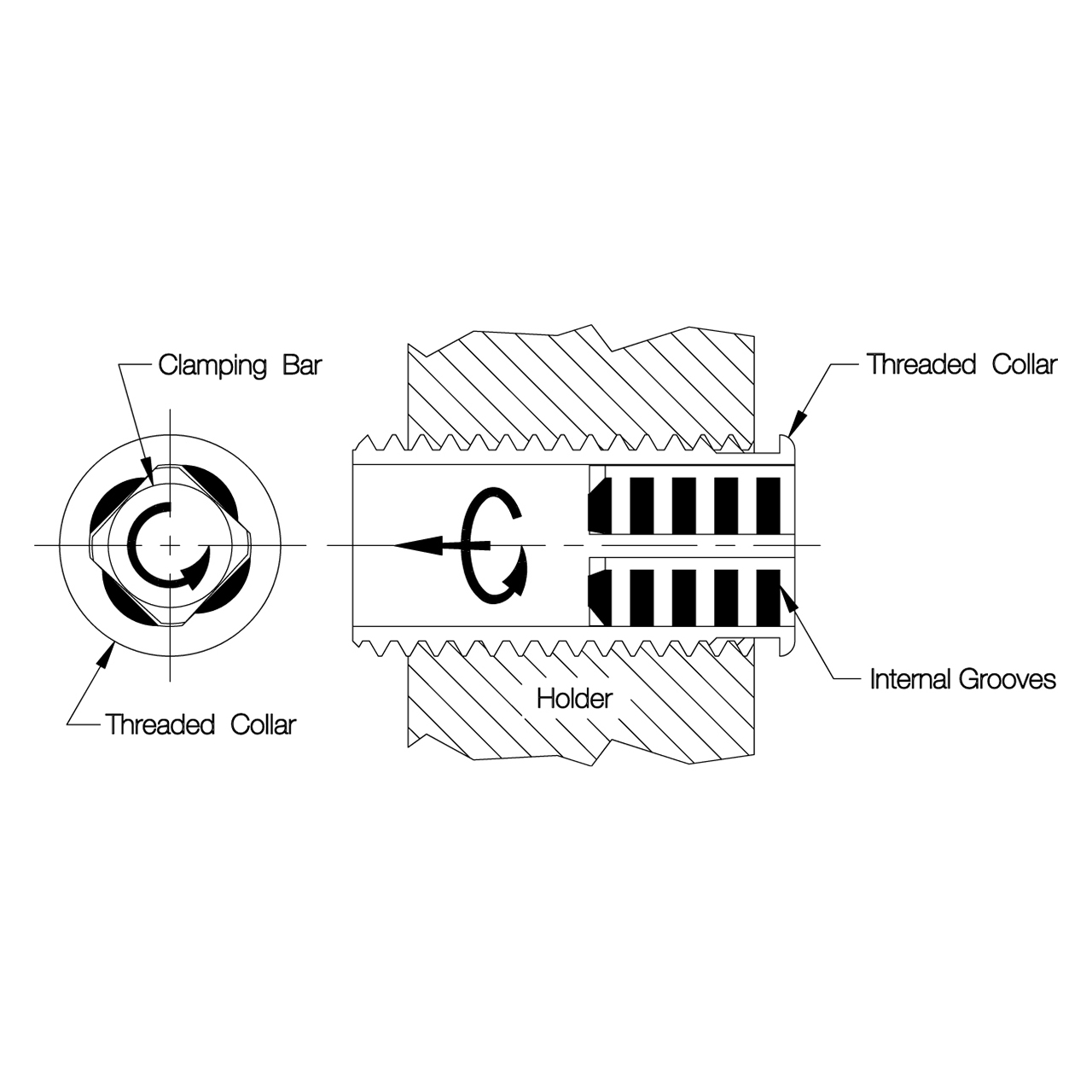 Clockwise Turning the clamping bar clockwise engages internal grooves in the threaded collar. Both components then turn together as a single unit to apply screw force. Counterclockwise Turning the clamping bar counterclockwise loosens the screw clamp and disengages the collar, allowing the bar to slide back and forth.