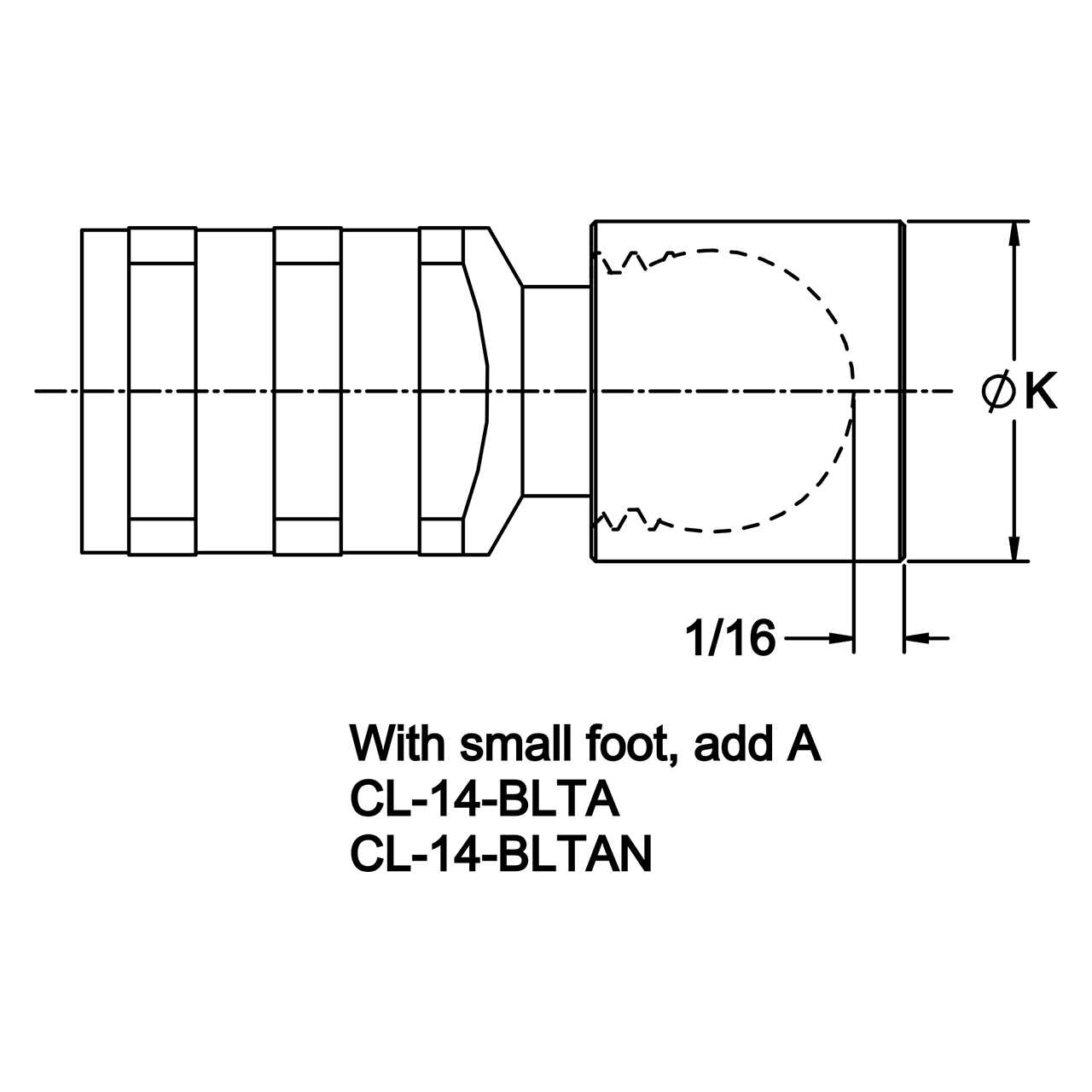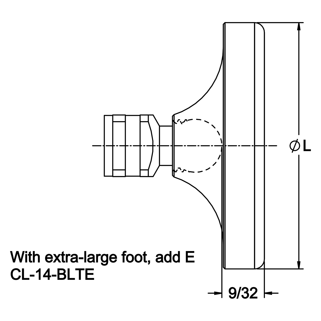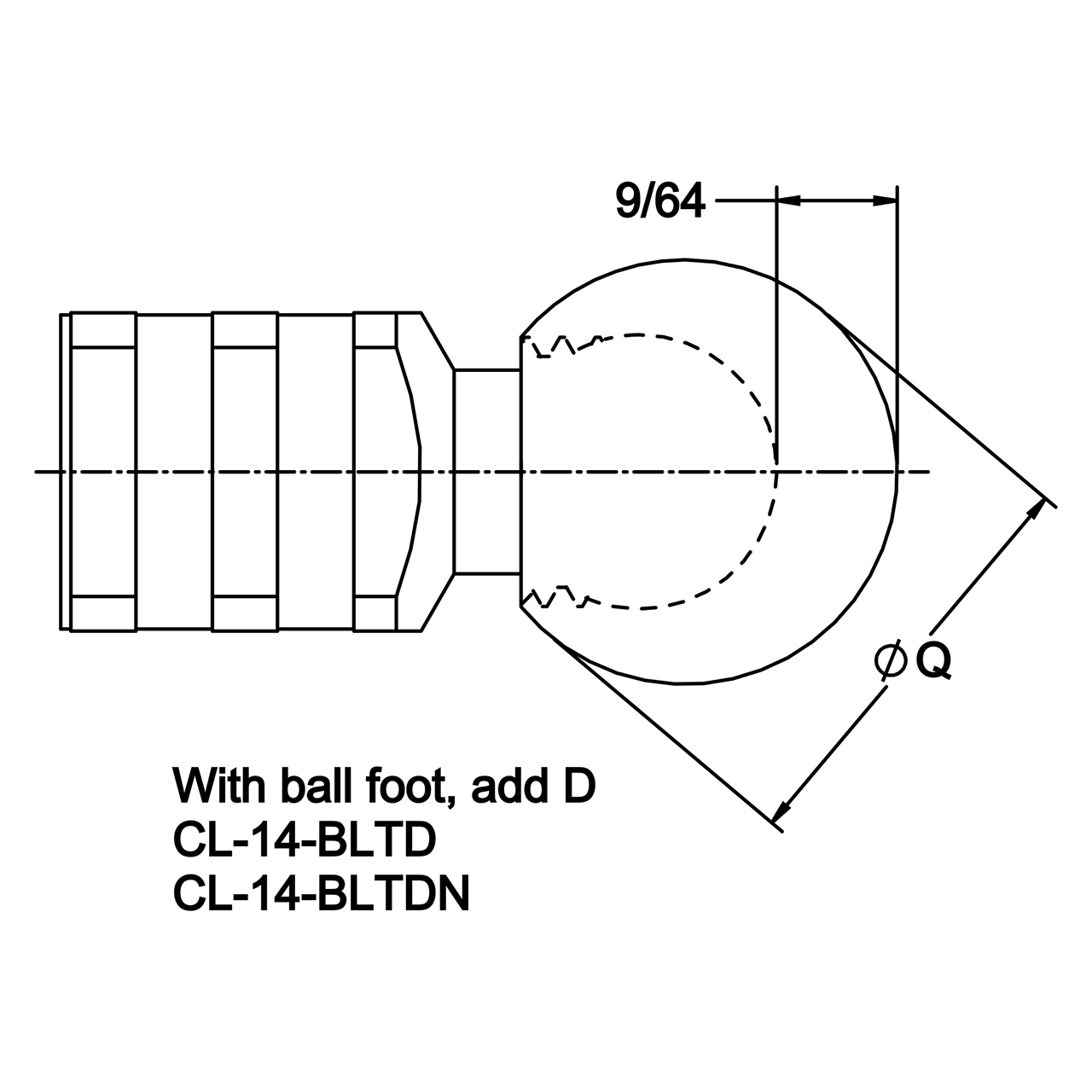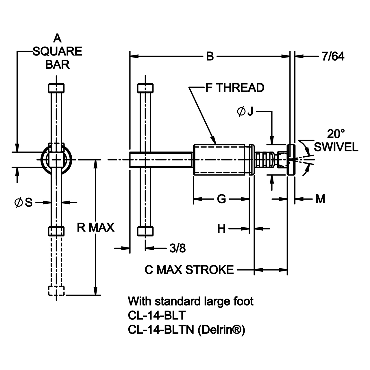 Choice of four foot types. Bar-Lok Quick-Acting Screw Clamps use our patented left-hand-thread swivel-foot system. The ball end of the body screws into the foot for easy installation and removal. Once the ball threads pass beyond the foot threads, the foot can rotate and pivot freely (20 Degree total angle). Foot threads are left-hand to positively prevent accidental backout during use. Delrin feet are optional for types A and B. To order with a Delrin foot, add "N" to the part number, e.g. CL-14-BLTBN. Note: Delrin feet are not threaded – they snap on and off.