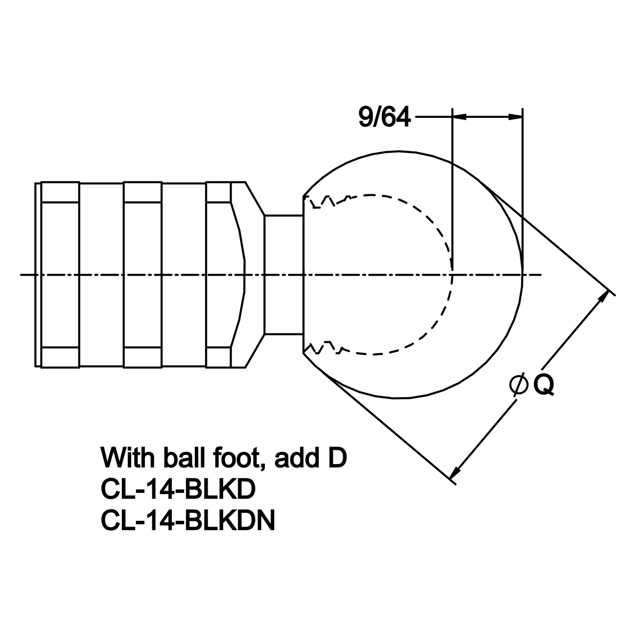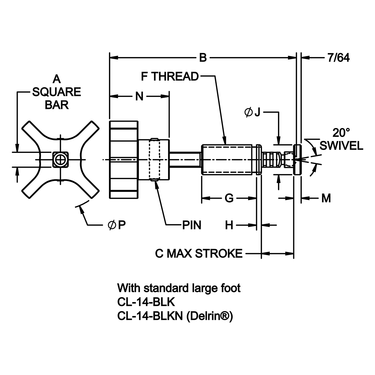 Choice of four foot types. Bar-Lok Quick-Acting Screw Clamps use our patented left-hand-thread swivel-foot system. The ball end of the body screws into the foot for easy installation and removal. Once the ball threads pass beyond the foot threads, the foot can rotate and pivot freely (20 Degree total angle). Foot threads are left-hand to positively prevent accidental backout during use. Delrin feet are optional for types A and B. To order with a Delrin foot, add "N" to the part number, e.g. CL-14-BLKBN. Note: Delrin feet are not threaded – they snap on and off.