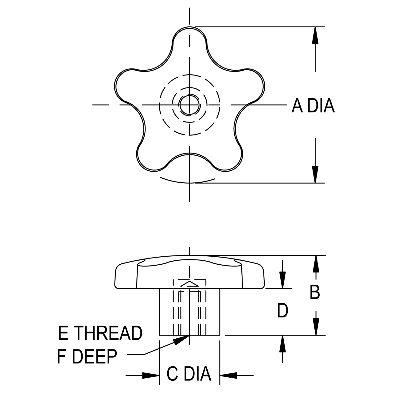 | Star Knobs (Cushion Grip) | Black cushion-grip plastic (soft touch, matte finish, rugged, excellent impact resistance, operating temperatures to 150 Degree, excellent grip ability even when wet or oily, absorbs vibration) | - | Molded-in Brass Insert | ✔ | ✔ |
