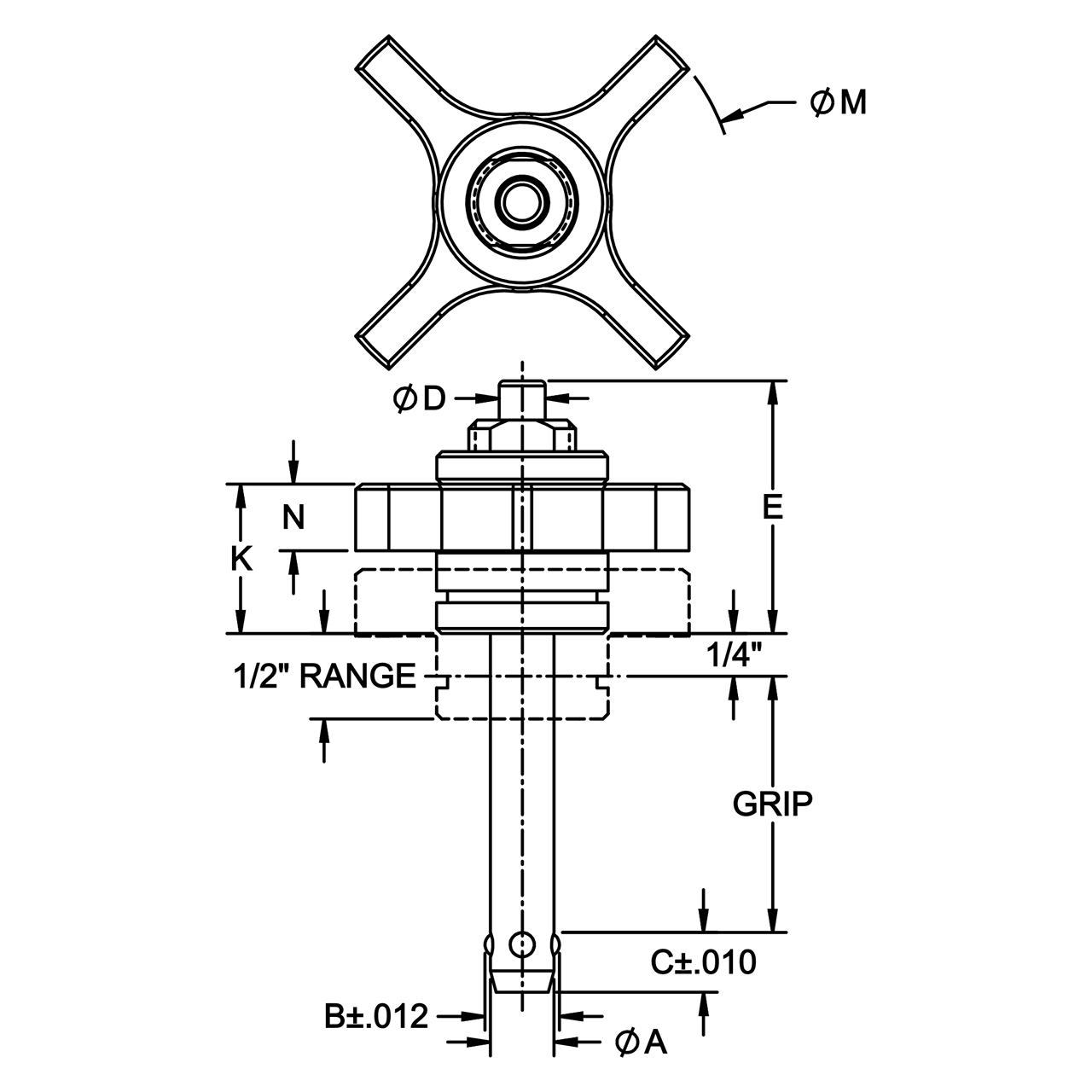 | Part Number | A DIA NOMINAL | A DIA ACTUAL | GRIP LENGTH | B | C | D DIA | E | K | M DIA | N |