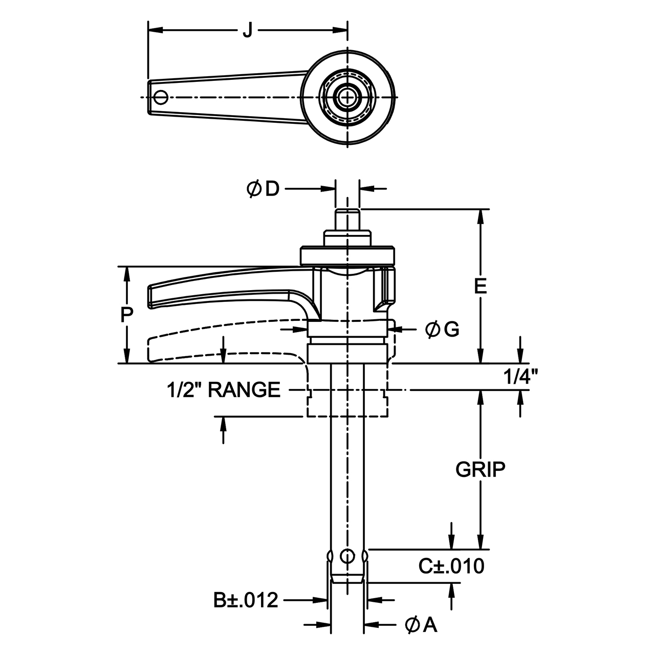 | Part Number | A DIA NOMINAL | A DIA ACTUAL | GRIP LENGTH | B | C | D DIA | E | G DIA | J | P |