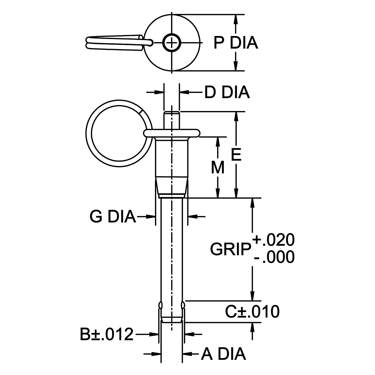 General Dimensions (Inch)The Basic Part Number shown here must be completed on the Pricing & Availability screen with a suffix for grip length (2-place decimal inch) and for any desired option, such as stainless steel material (-S) or an attached cable (-C). For complete part numbers of stock grip lengths in each diameter, see tables at the bottom of this page. BASIC PART NO. A DIA NOMINAL A DIA ACTUAL B C K DIA L M N P DIA CL-3-BLPB 3/16 (#10) .1885 / .1870 .219 .245 .22 1.26 .89 .47 .82 CL-4-BLPB 1/4 .2485 / .2470 .290 .275 .22 1.26 .89 .47 .82 CL-5-BLPB 5/16 .3110 / .3095 .375 .315 .22 1.26 .89 .47 .82 CL-6-BLPB 3/8 .3735 / .3720 .438 .350 .27 1.47 1.02 .59 1.00 CL-7-BLPB 7/16 .4360 / .4345 .508 .365 .27 1.47 1.02 .59 1.00 CL-8-BLPB 1/2 .4985 / .4970 .592 .445 .39 1.61 1.08 .75 1.31 CL-9-BLPB 9/16 .5610 / .5595 .666 .495 .39 1.61 1.08 .75 1.31 CL-10-BLPB 5/8 .6235 / .6220 .750 .565 .50 1.81 1.25 .93 1.56 CL-12-BLPB 3/4 .7485 / .7470 .886 .655 .50 1.81 1.25 .93 1.56 CL-14-BLPB 7/8 .8735 / .8720 1.044 .745 .71 2.07 1.49 1.30 2.16 CL-16-BLPB 1 .9985 / .9970 1.217 .875 .71 2.07 1.49 1.30 2.16