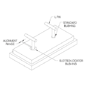 A standard press-fit bushing (for primary location) and a Slotted Locator Bushing (for secondary location) are used with L Pins to align two holes without binding.