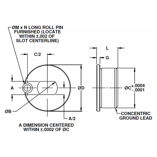 To install, first drill and ream hole for roll pin (furnished), then bore large bushing hole for .0003-.0005" press fit. Press in bushing and roll pin simultaneously for accurate orientation.