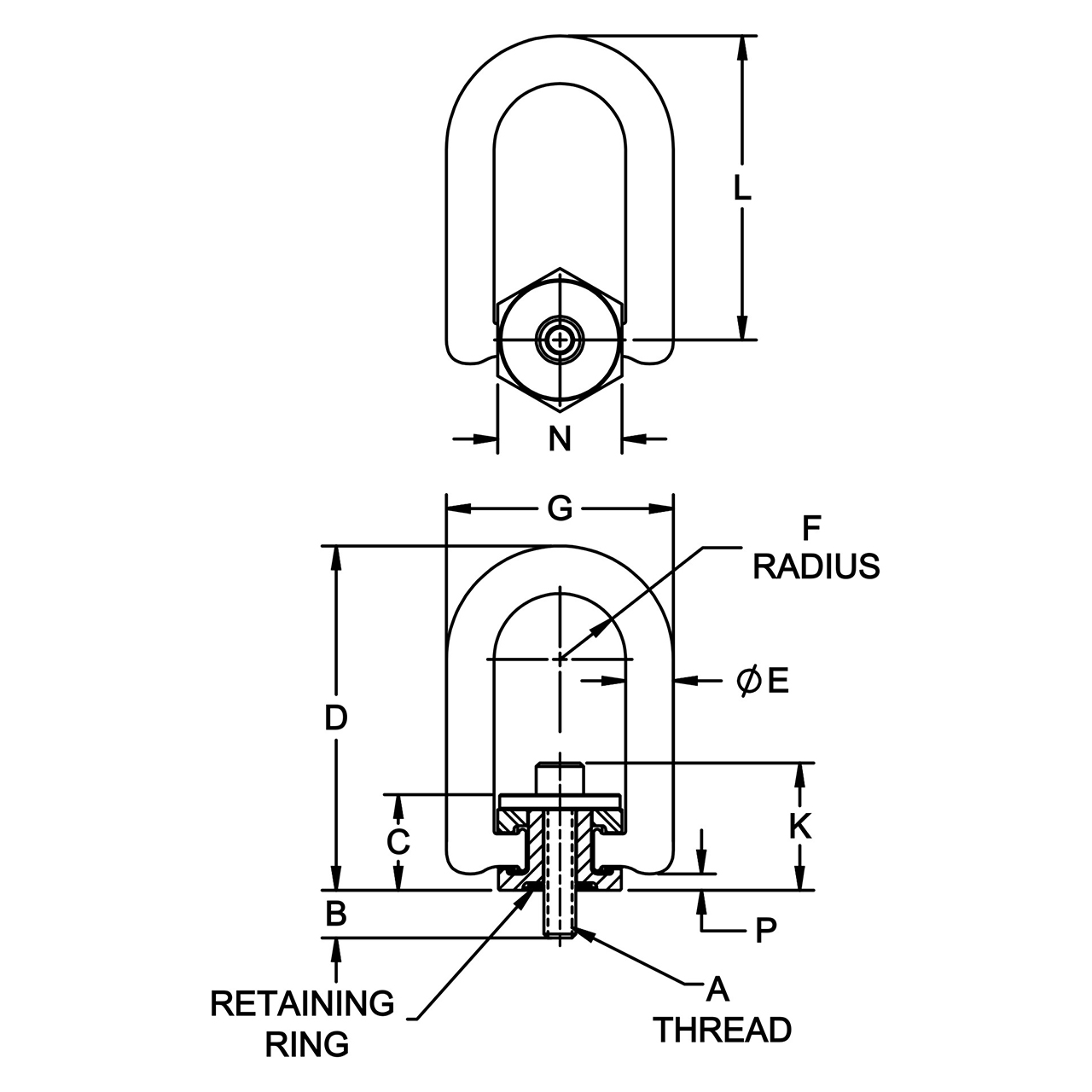 | Part Number | LOAD RATING (TON) | A THREAD | B | C | D | E DIA | F | G | K | L | N | P | INSTALLATION TORQUE (ft-lbs) |