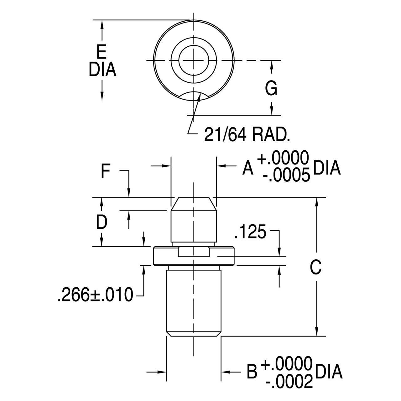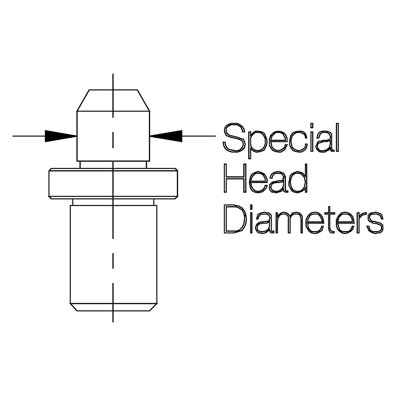 Pins with a special head diameter (A dimension) are quickly made to order in any of the four standard shank diameters. 5 5/16" shank 8 1/2" shank 12 3/4" shank 16 1" shank Head diameters are limited to the following ranges: 5 .1150-.3180 8 .2780-.5040 12 .4640-.7540 16 .7140-1.0040Example:For a Round Locating Pin with a 1/2" shank and A = .4000", specify part number as CL-8-RLT-.4000.