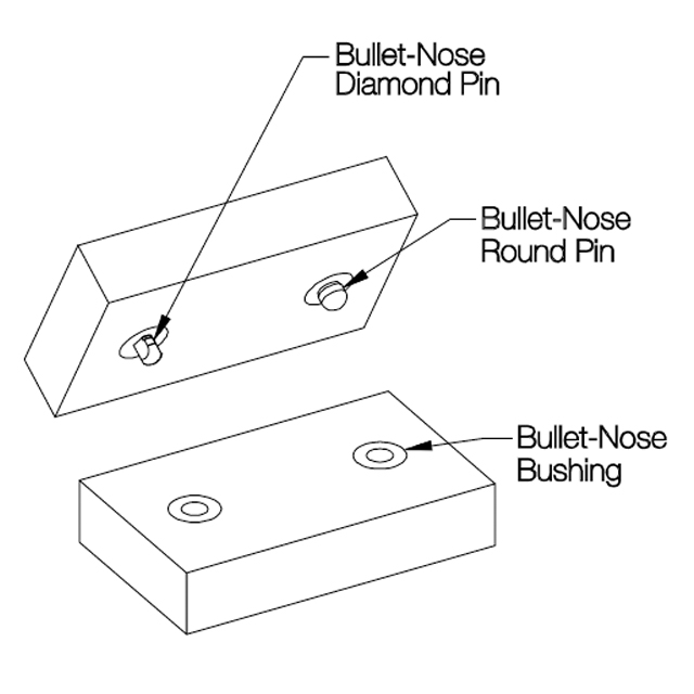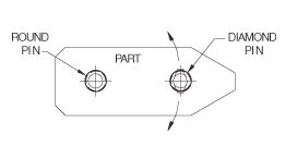 When a round pin and diamond pin are used together, the round pin is the primary, 2-axis locator, while the diamond pin is the secondary, 1-axis locator. Diamond pins are relieved to locate only radially around the round pin, avoiding redundant location. This prevents binding, yet still maintains high accuracy.