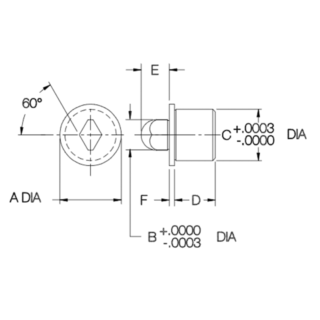 Precision bullet-nose locating pin often used with a mating bushing to align two pieces of a fixture. One Bullet-Nose Round Pin and one Bullet-Nose Diamond Pin are often used together to locate two holes without binding, because the diamond version is relieved to locate in only 1 axis. The pin's shank diameter and the bushing's OD are exactly the same size, to allow boring the installation hole in both fixture pieces at the same time for greater accuracy.The pin's head and shank diameters are concentric to within 0.0005" TIR. Made in USA.