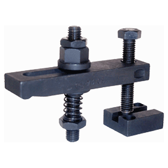 Tapped-Heel Clamp Straps have a tapped hole that accepts either a clamping screw for use with a slotted guide block, as shown here, or an adjustable rear support.