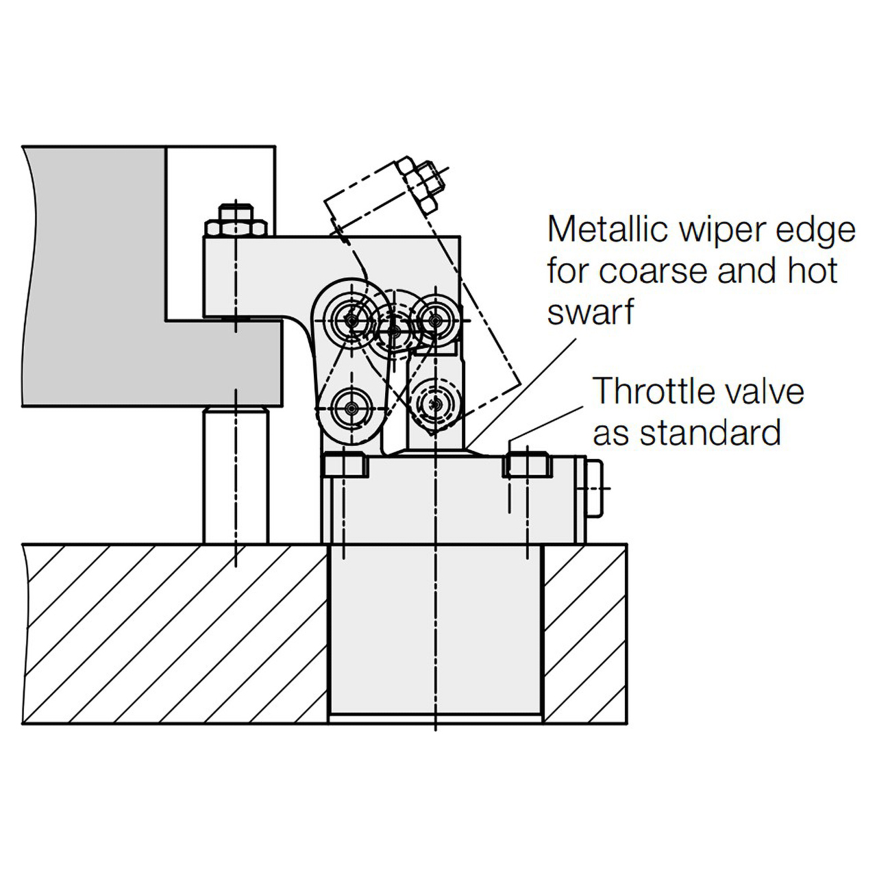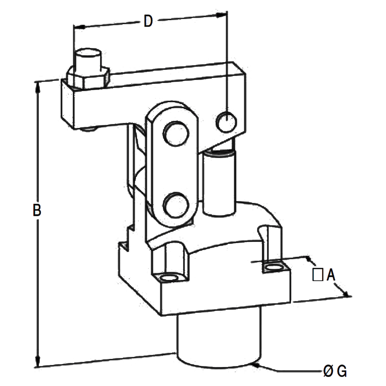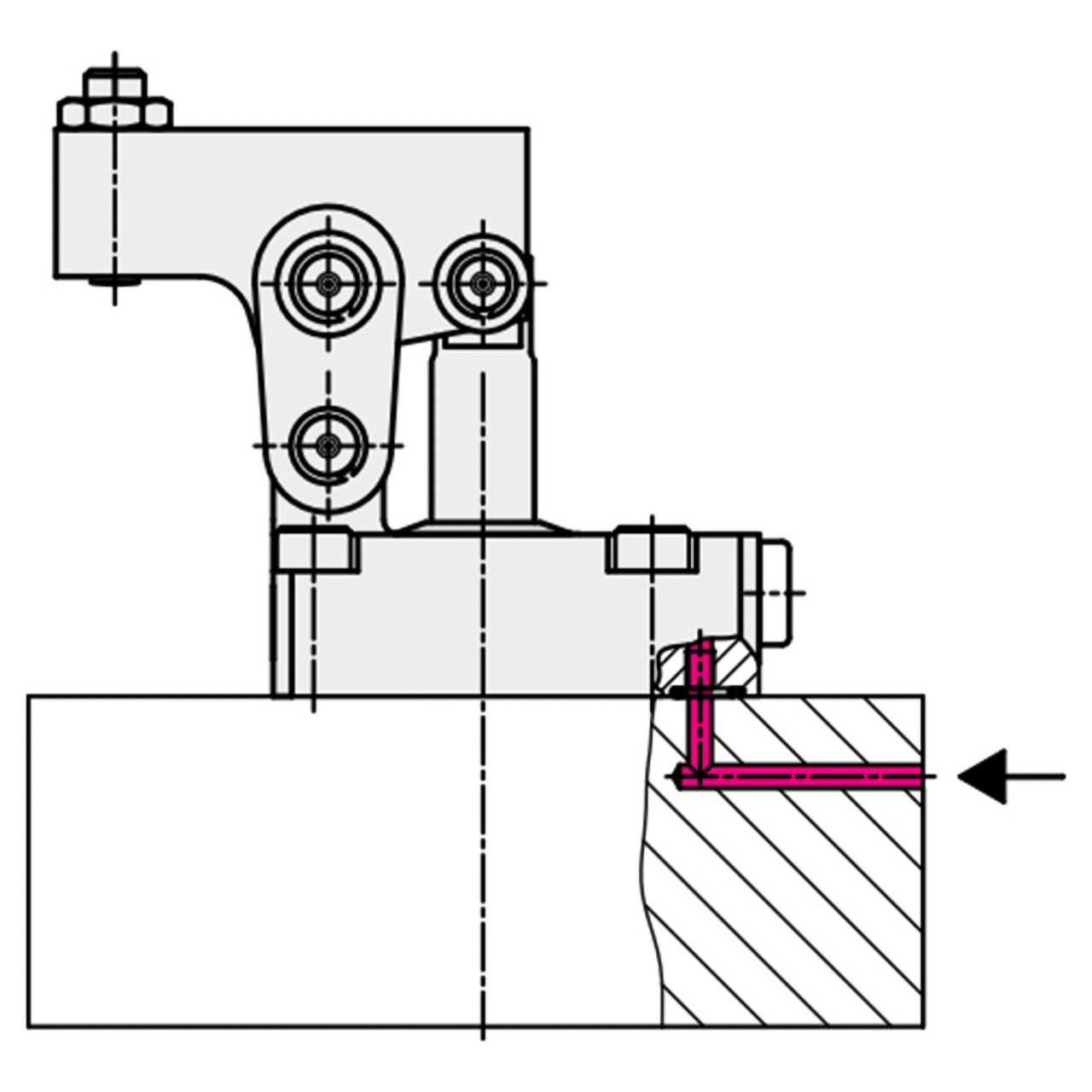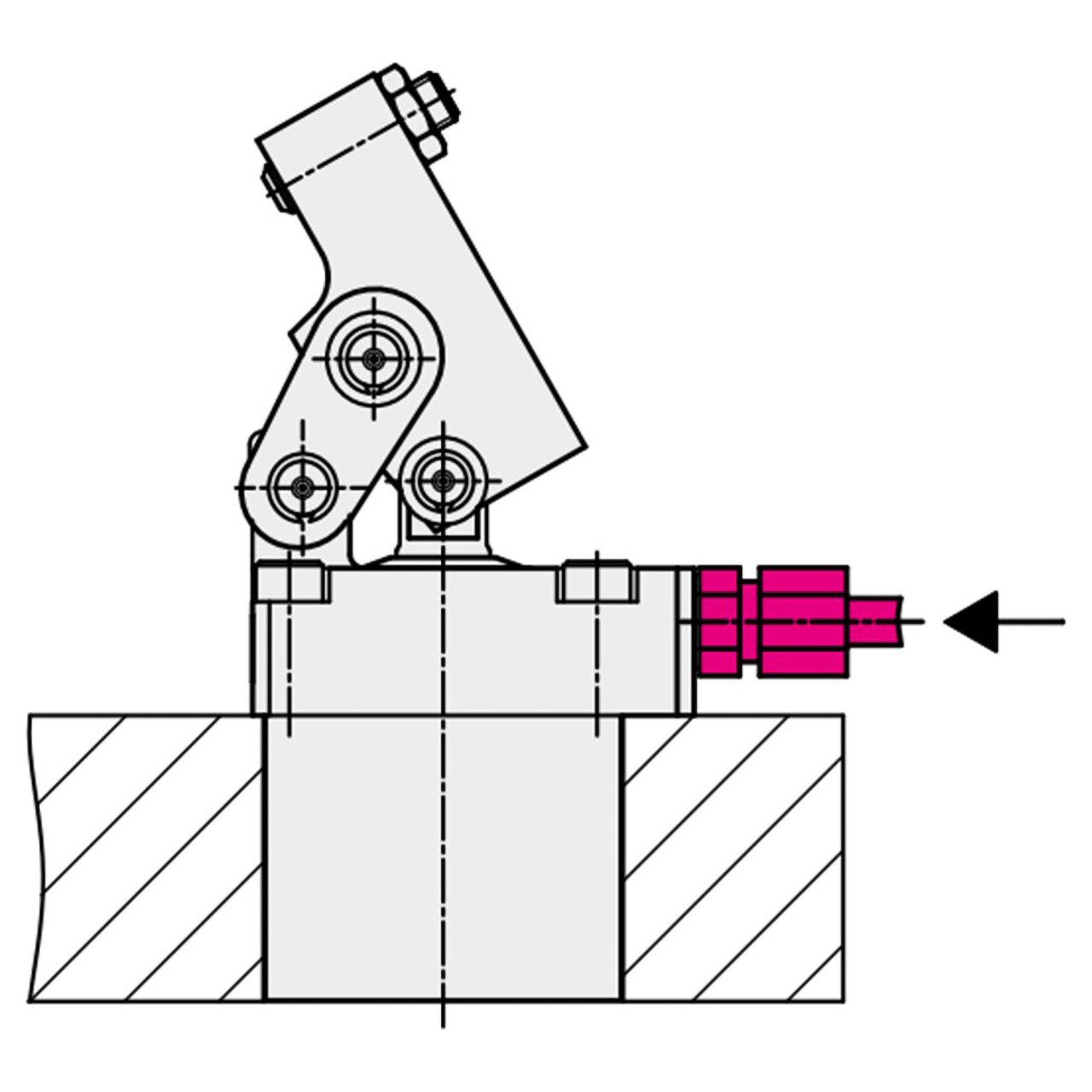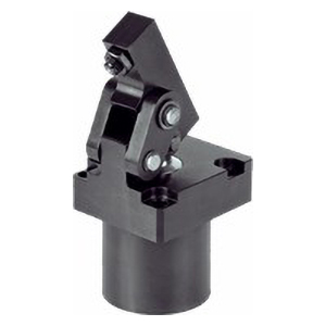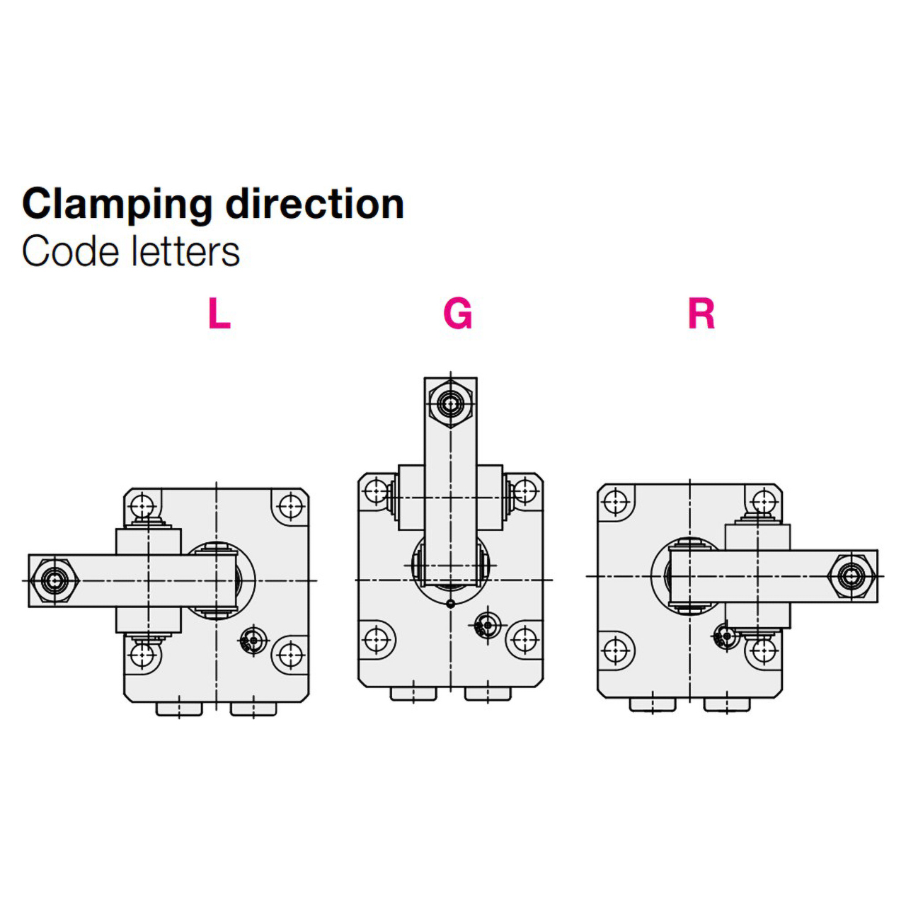 1000 psi max Double Acting This unique series of Hinge Clamps provides considerable clamping force at lower hydraulic pressures, allowing direct connection to the low-pressure hydraulic system of a machine tool. These are extremely compact, heavy-duty clamps with a sturdy linkage configuration that moves the clamping arm forward as it pivots into clamping position. This specially designed linkage allows the clamp to exert nearly perfectly vertical clamping force. The clamping arm retracts fully for clear loading from above. Durable, economical clamp with an easy-to-clean mechanism, standard metallic wiper, and built-in throttle valve. The top-flange design is ideal for space-saving manifold mounting. Available in five clamp sizes, double acting only, each with either a standard clamping arm with swivel contact bolt, a long clamping arm for customization, or without a clamping arm for a user-manufactured arm. Choice of three clamping directions – straight, left, or right. Clamping force at 1000 psi with standard clamping arm: 580 Lbs 790 Lbs 990 Lbs 1750 Lbs 2700 Lbs