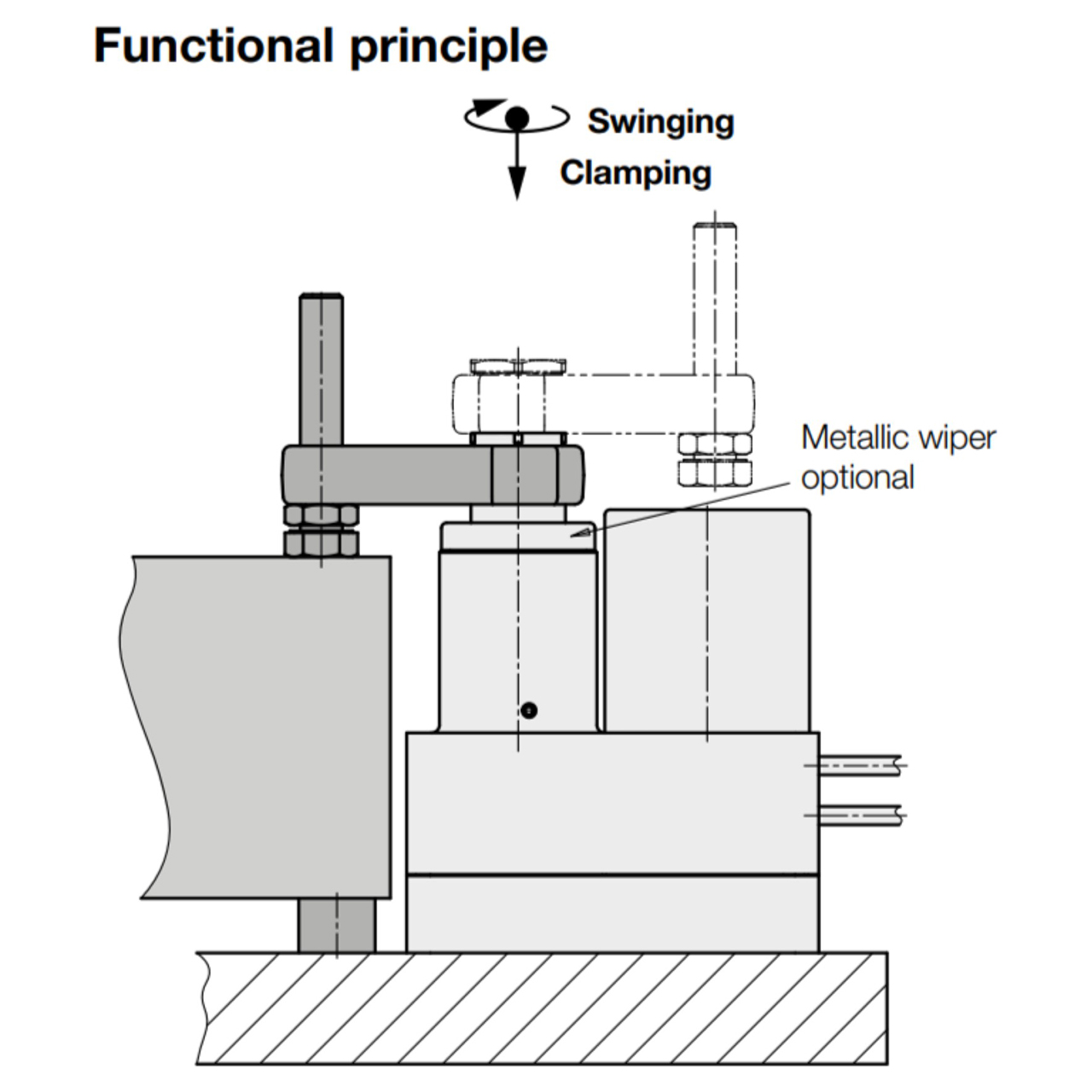 The electric swing clamp is driven by a wear-resistant brushless DC motor. The motor speed is transformed by means of a gear and a threaded spindle into the swing and stroke movement of the piston rod. During the 180 Degree swing of the clamping, an axial stroke of only 3 mm is required. If the clamping arm collides during the swing motion with a workpiece, the mechanism is protected against overload. The direct current motor is automatically and immediately switched off. When unclamping, the clamping arm always swings back to the off-position. BENEFITS • High clamping force• Adjustable clamping force• Clamping force monitoring• FAILSAFE - High operating safety by a self-locking spindle drive• Mechanical re-clamping by Belleville springs• Swing angle up to 180 Degree available• Overload protection device in the case of collisions with the clamping arm• Electric position monitoring and extensive self-monitoring with diagnostic options• Clamping stroke control possible• Low voltage 24 VDC• Maintenance-free (500,000 cycles).• Code class IP 67