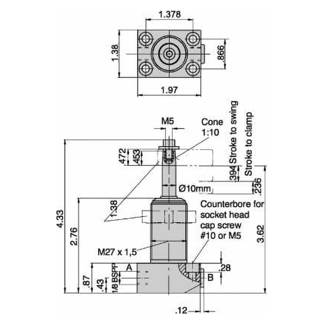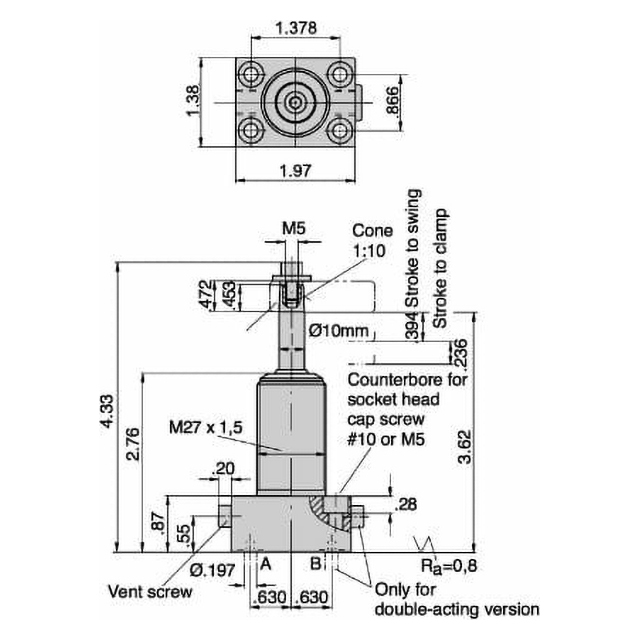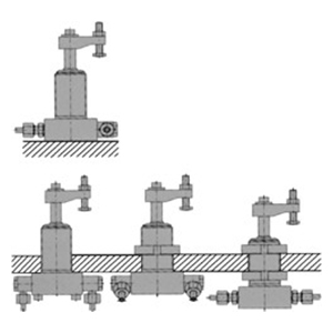 Version 1Standard Fittings Version 2Manifold Mounting These Swing Clamps are available in two versions, one for use with standard fittings and one for manifold mounting. Version 1, for standard fittings, has a 1/8" BSPP port (two for double-acting clamps). Version 2, for manifold mounting has O-ring ports underneath instead of standard ports. Do not use NPT fittings. For manifold mounting, the mounting surface must be ground flat to ensure proper O-ring sealing. Both clamp versions can be fastened to the top of a fixture plate with four socket-head cap screws inserted through the flanged base from above. Version 2 clamps, with standard fittings, can alternatively be mounted: a) Through a bored hole in the fixture plate, fastening with four socket-head cap screws inserted through the flanged base from below;b) Through a tapped hole in the fixture plate, securing with a lock ring;c) Through a bored hole in the fixture plate, securing with one or two lock rings.