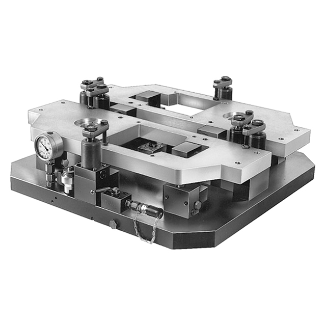 Flange-base swing clamps are used together with Work Supports on a pallet fixture. All components are manifold mounted, so the fixture is entirely free of tubing lines.