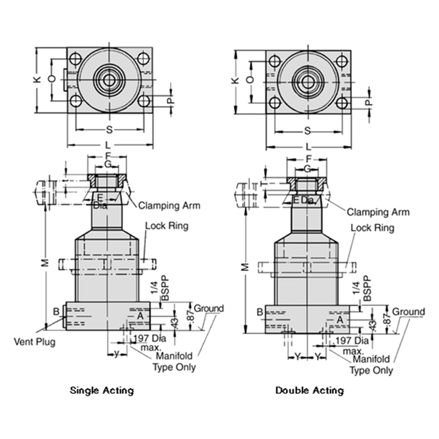 Version 1Standard Fittings Version 2Manifold Mounting These Swing Clamps are available in two versions, one for use with standard fittings and one for manifold mounting. Version 1, for standard fittings, has a 1/4" BSPP port (two for double-acting clamps). Version 2, for manifold mounting has O-ring ports underneath instead of standard ports. Do not use NPT fittings. For manifold mounting, the mounting surface must be ground flat to ensure proper O-ring sealing. Both clamp versions can be fastened to the top of a fixture plate with four socket-head cap screws inserted through the flanged base from above. Version 2 clamps, with standard fittings, can alternatively be mounted: a) Through a bored hole in the fixture plate, fastening with four socket-head cap screws inserted through the flanged base from below;b) Through a tapped hole in the fixture plate, securing with a lock ring;c) Through a bored hole in the fixture plate, securing with one or two lock rings.