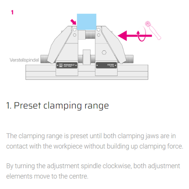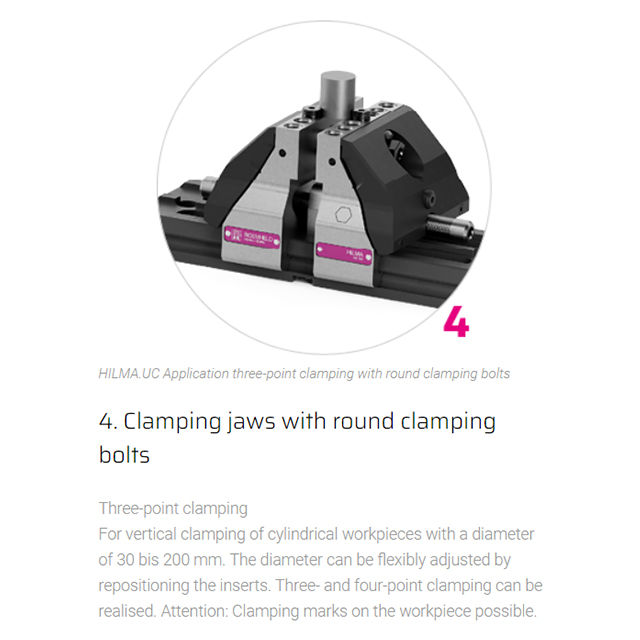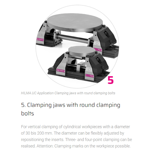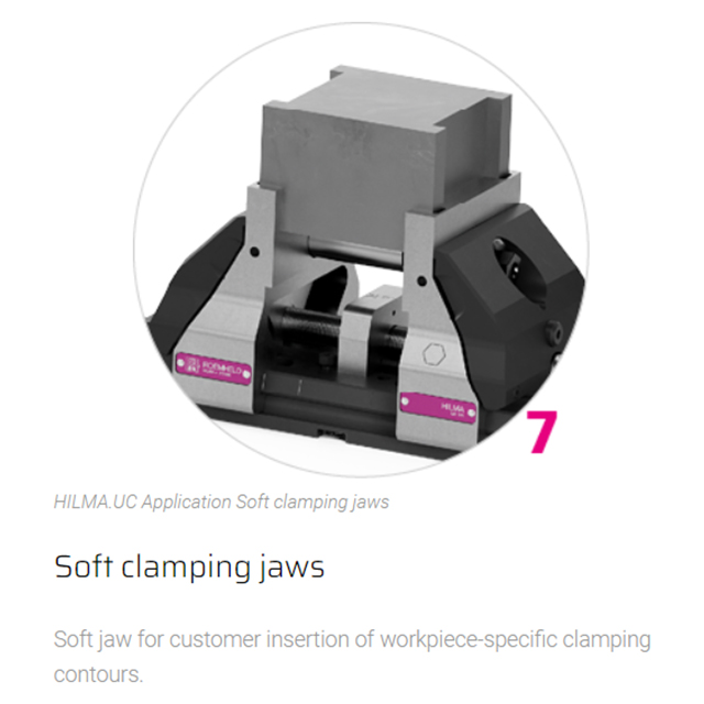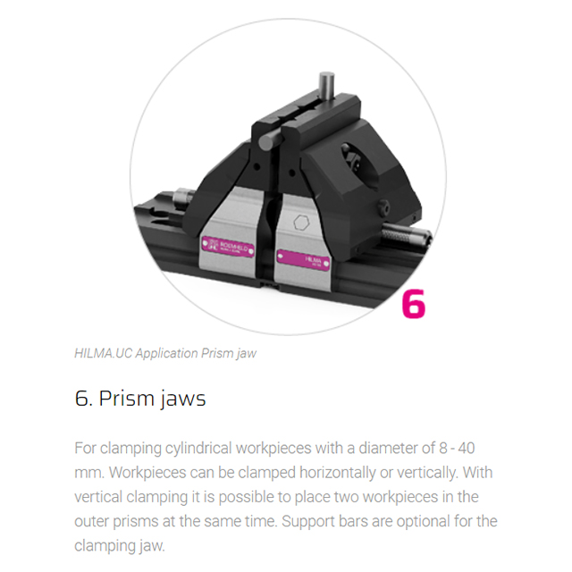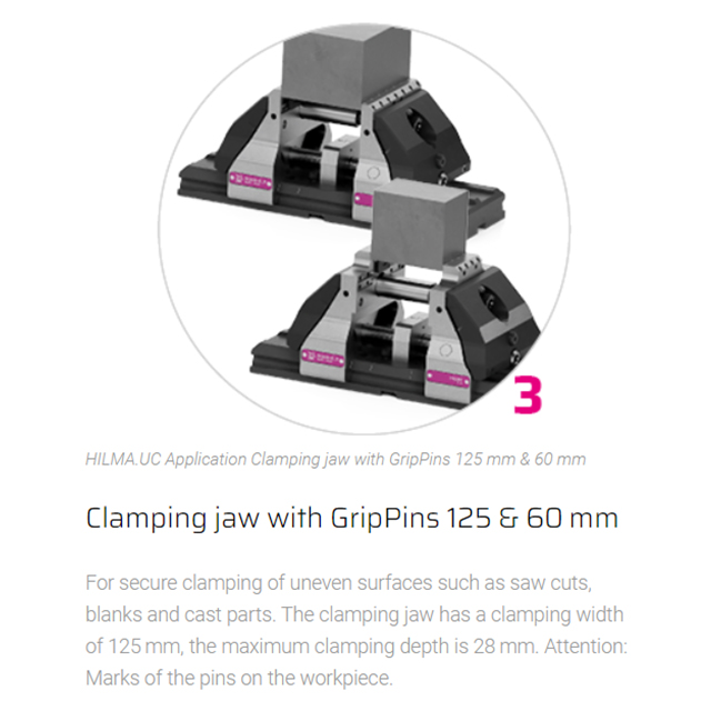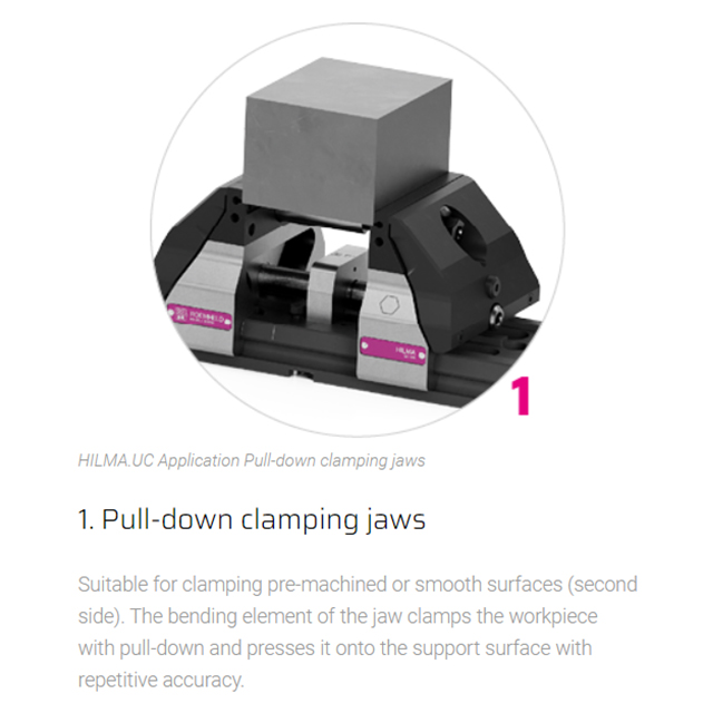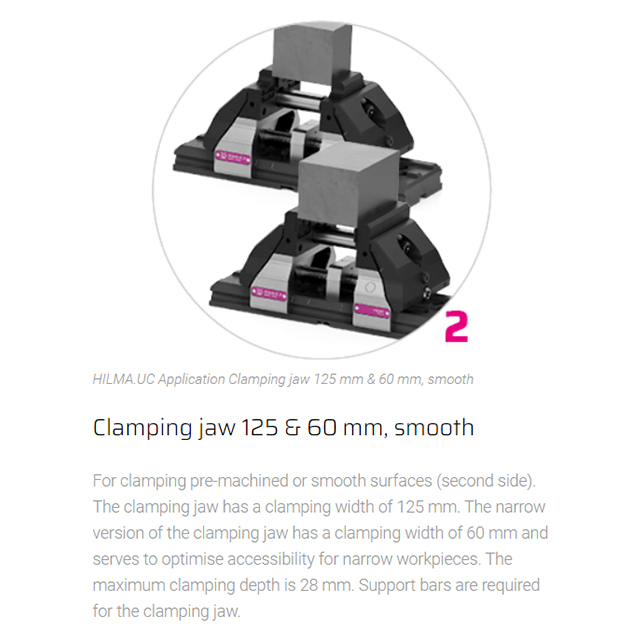 Concentric, modular, precise Jaw width 125 mm The mechanical HILMA.UC clamping system is suitable for numerous clamping tasks and is used for machining dimensionally stable workpieces in single or multiple clamping systems. Small workpieces as well as large plates can be clamped and machined without large interference contours. Even when production requirements change, there is no need to invest in new clamping devices. Special features of the HILMA.NC machine vise family:• universal modular system enables versatile clamping options• stabile no deflection thanks to closed force flow• compact reduced design ensures optimum accessibility • precise true to position due to pull-down mechanism