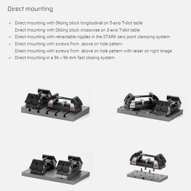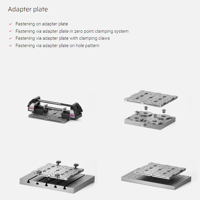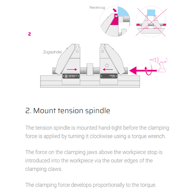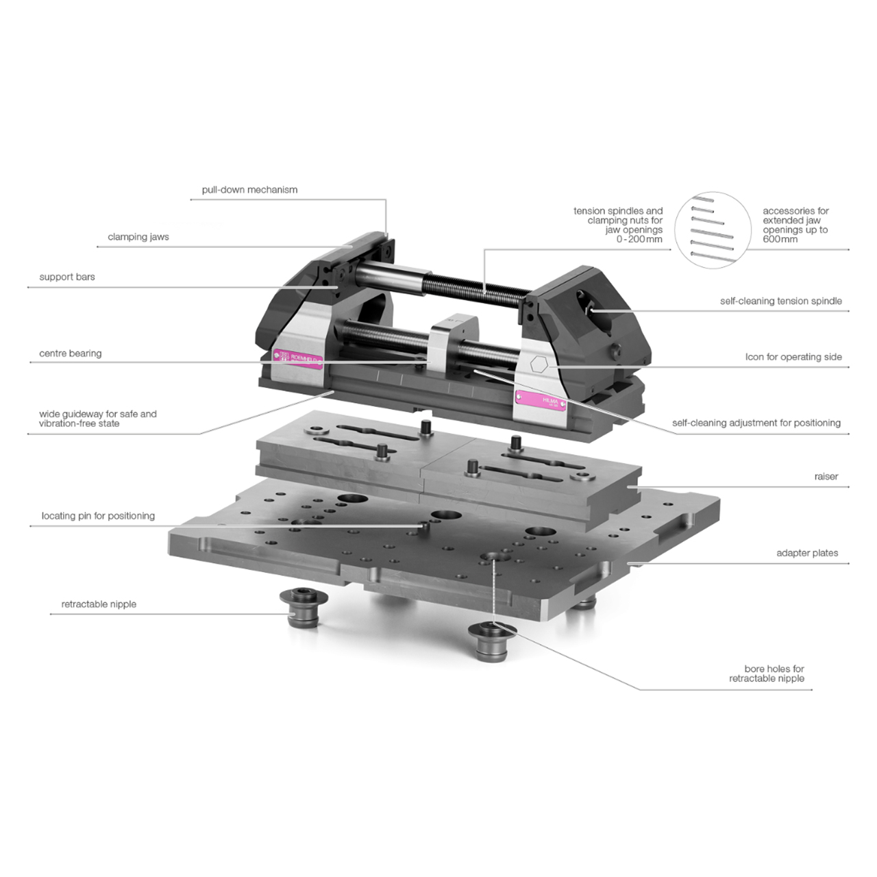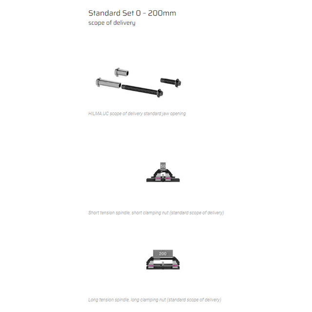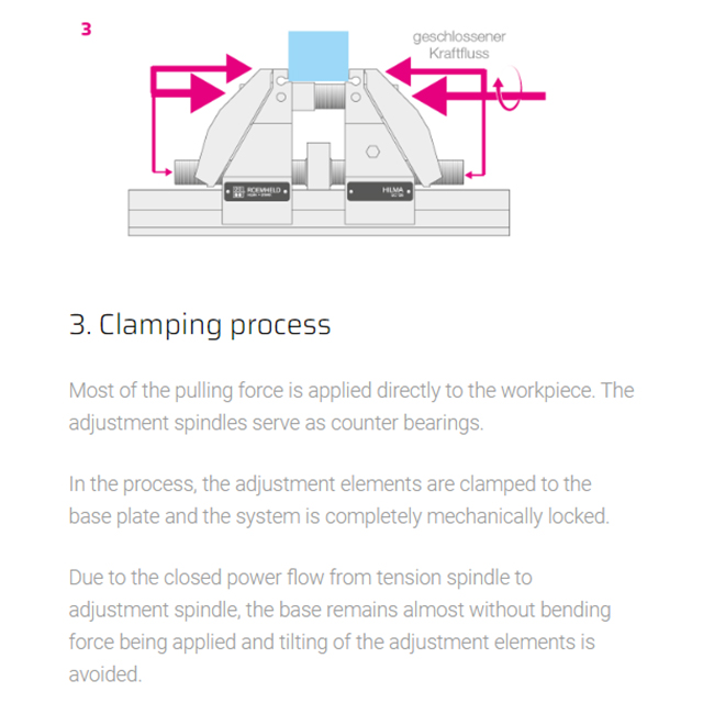 The concentric clamping system can be divided in the middle and extended. The clamping range can be extended up to 600 mm by using different tension spindle/clamping nut combinations. A closed force flow is created between the tension spindle, adjustment element and clamping jaw, thus allowing the modular design. The base plate remains without a bending force being applied. The extended clamping system can be mounted directly on the machine table, raisers or adapter plates.