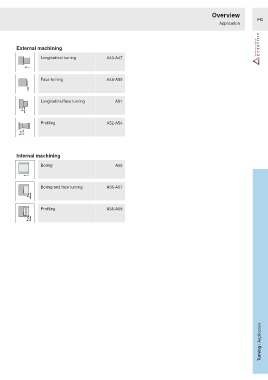 Overview A42 Application External machining Longitudinal turning A43-A47 Face turning A48-A50 Longitudinal/face turning A51 Profiling A52-A54 Internal machining Boring A55 Boring and face turning A56-A57 Profiling A58-A59 Turning / Application