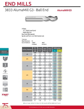END MILLS 3833 AlumaMill G3 - Ball End Advanced Performance UNCOATED FC-5 I M IMPERIAL METRIC ■ Brass & Copper ■ High Si Al ■ Low Si Al ■ Composites ■ Plastics ■ General Purpose 16 Visit fullertontool.com for the most up to date information.