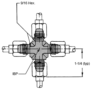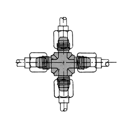 CLR-304-F Cross fitting has fThe male JIC 37° ends that accept standard 5/16" O.D. flared tubing. JIC-standard 37° fittings accept The standard 5/16" O.D. tubing (cut off straight, deburred, and flared) as well as Fixture Hose and Heavy-Duty Hose with 37°-flare swivel nuts. When using tubing, a Tube End fitting (CLR-400-F), consisting of a nut and sleeve, must be placed on each tube end before flaring is completed.
